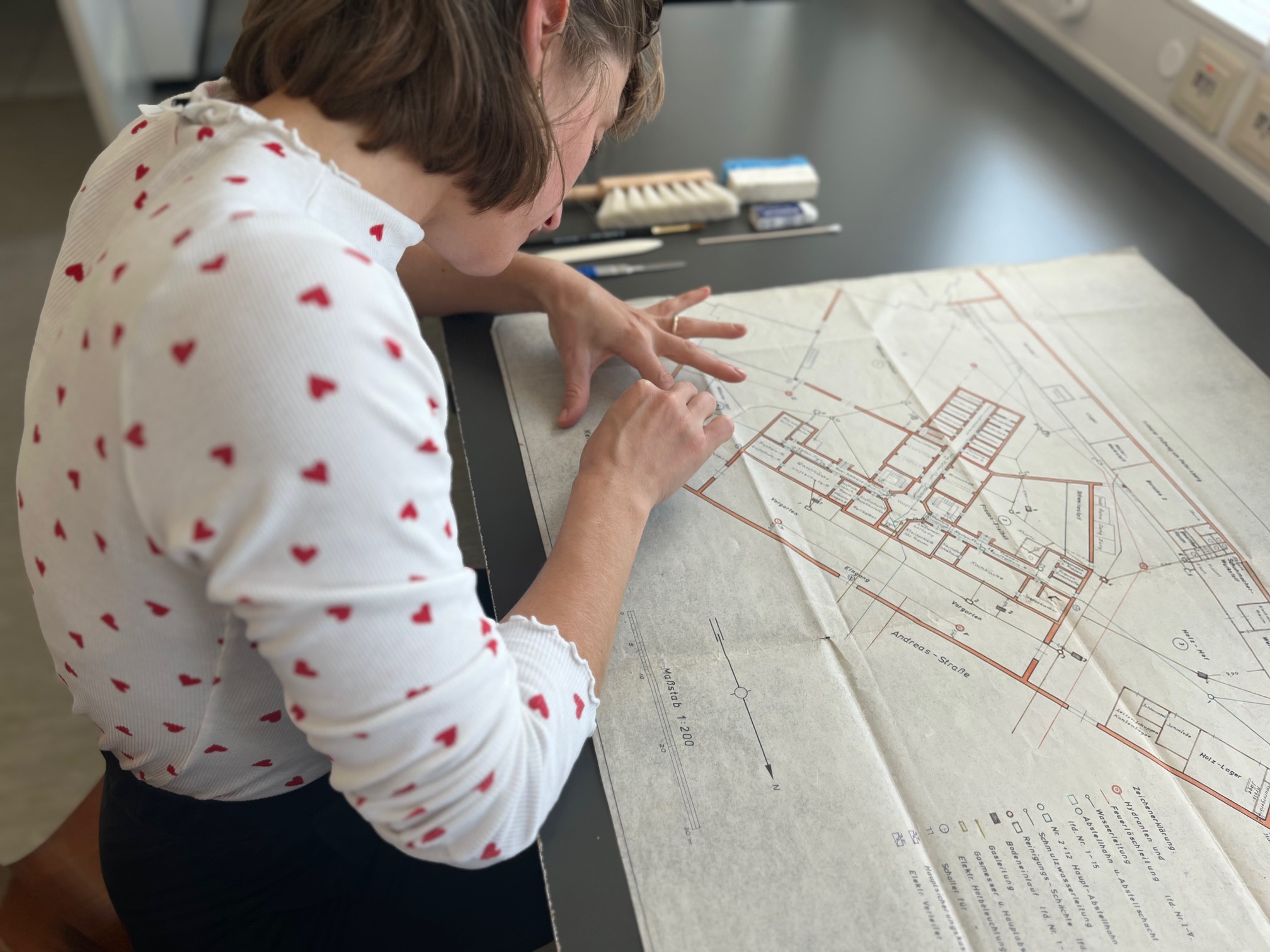 Seit 11/2020 Restaurierung von Plänen des Stiftungsgebäudes Andreasstraße, geschichtlich relevanten Dokumenten (Plakate, Bücher, Verträge etc.)